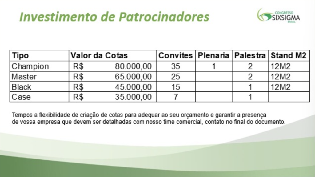 Associar-se a um evento de prestígio como o Congresso Six Sigma Brasil reforça sua imagem como uma empresa comprometida com excelência e inovação. Mostre ao mercado que sua organização está na vanguarda das melhores práticas de gestão.